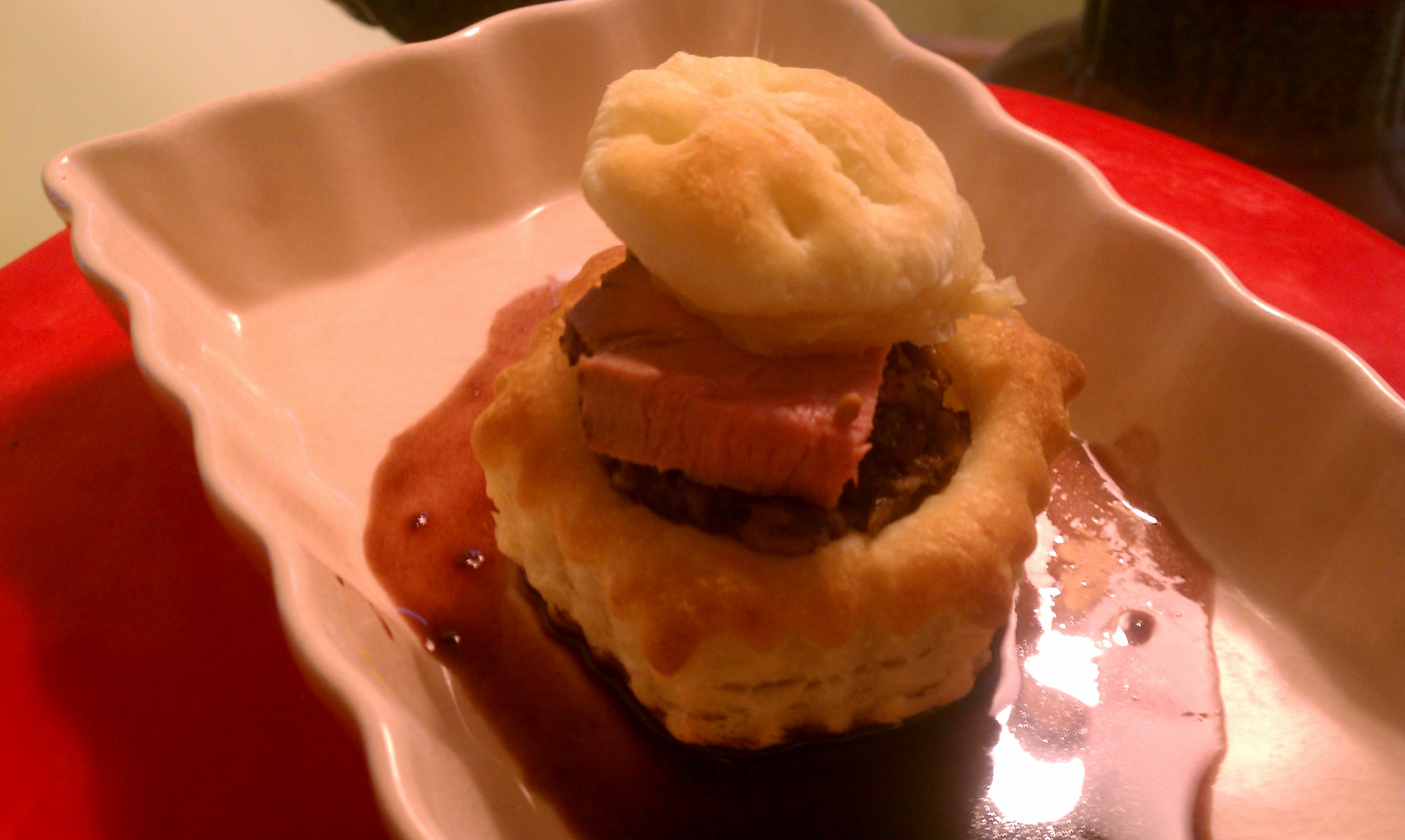 Place the pastry shells on a baking sheet, and bake according to package directions. Remove the center portion once baked. Place ½ oz (1/12th ) of the foie gras into each shell. Fill remaining space in the shell with mushroom mixture (duxelles). Top with one 1 piece of beef. Place on serving platter, and serve Port sauce on the side.