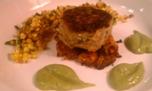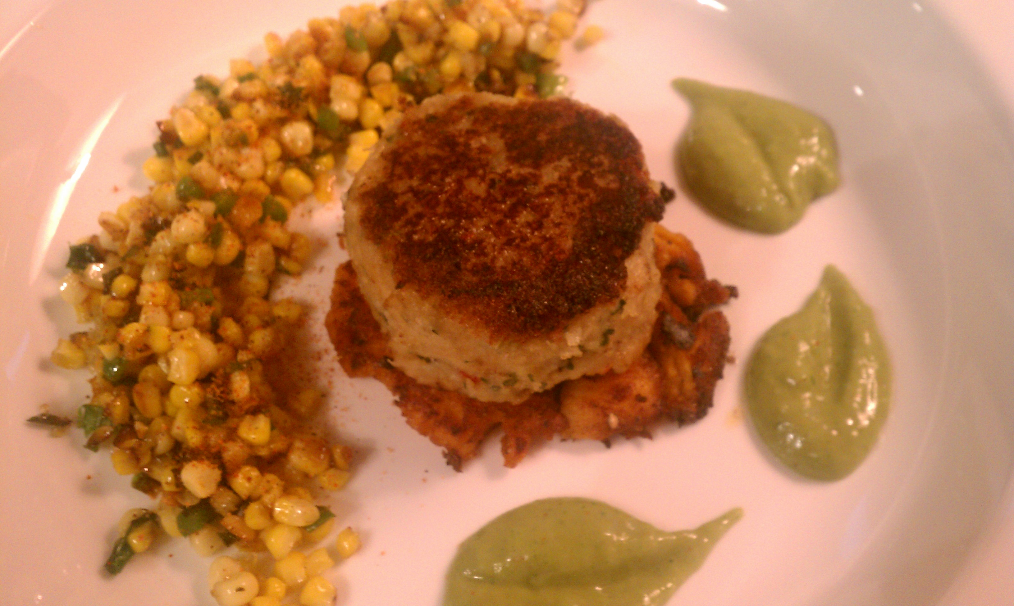 Sweet Potato Tostones with Blue Crab Cake, Jalapeno Fried Corn, and Citrus Avocado Cream