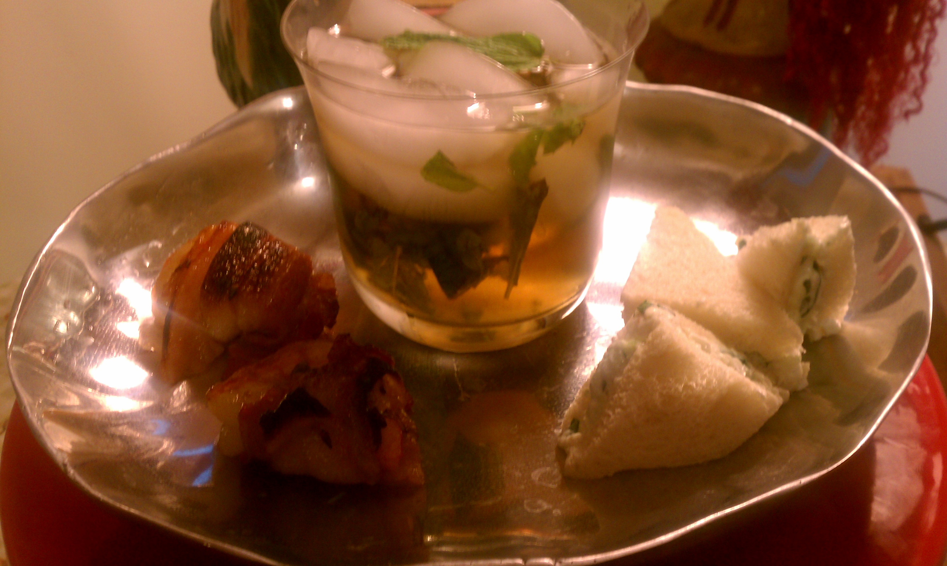 Like the Southern Belle’s and Gentlemen that drink them, the pretty name of this favorite southern drink belies its inner strength.  It’s straight bourbon, with mint and a bit of sugar, over lots of crushed ice, to help fight the heat on a sweltering summer night in the South.