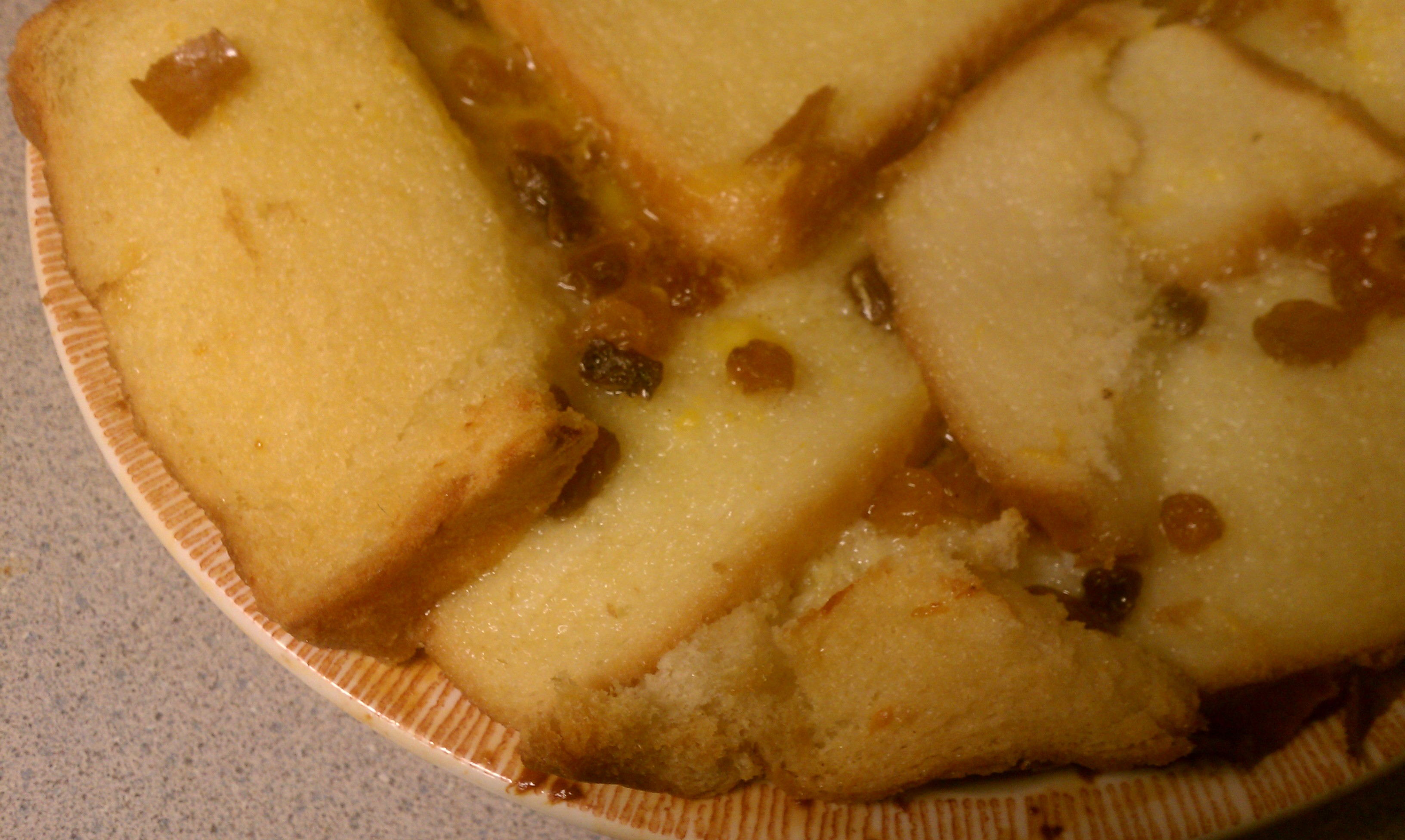 In a 2 quart casserole, or a 10 inch deep dish pie plate, place one layer of bread, cutting as needed to fit.  Sprinkle with 1/3 of the raisins.  Repeat with remaining bread and raisins.  Slowly pour custard base over the bread, stopping to wait if necessary for some of the custard to be absorbed.  Reserve remaining custard if it won’t all fit.  Press down gently with the back of a large spoon, and let sit for 30 minutes.  Add additional custard if possible.