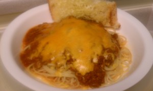 Cincinnati Chili—serve chili over spaghetti noodles, topped with shredded cheddar cheese and chopped onions.