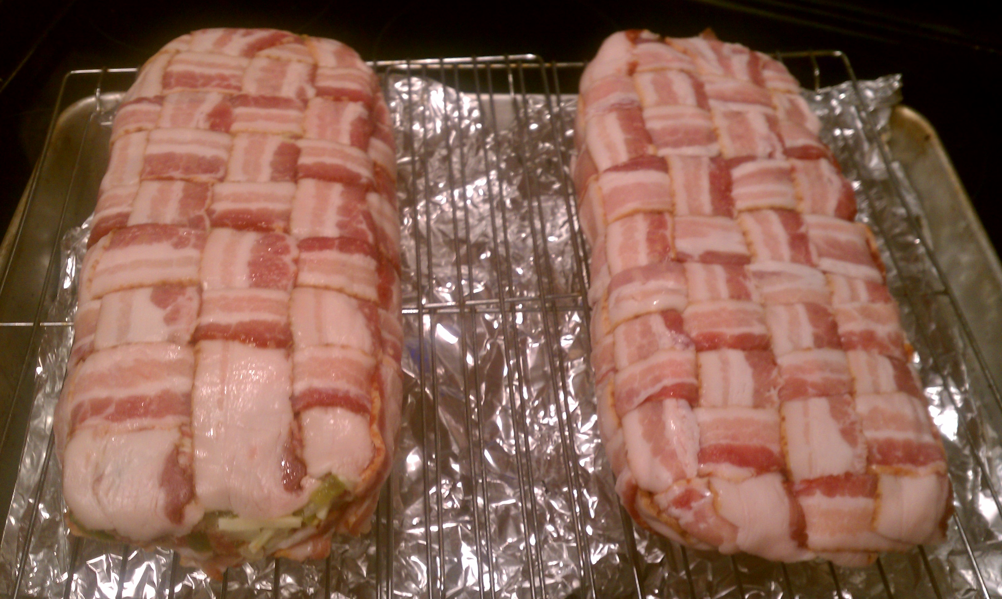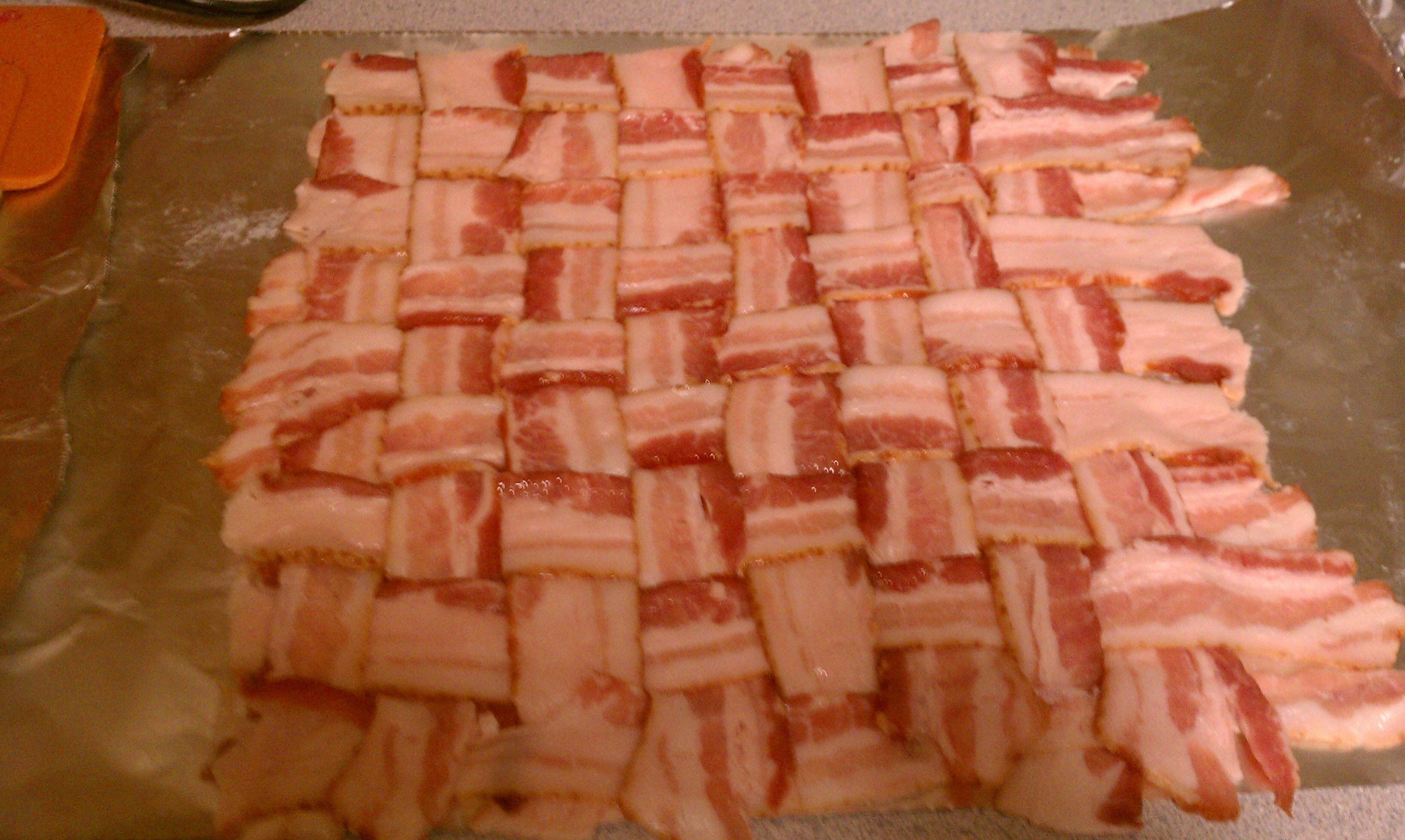 Weave the bacon into a lattice on a square of foil. Make sure the weave is nice and tight, eliminating gaps as much as possible. Place in the refrigerator on a baking sheet