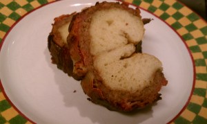 Mix together the butter, sugar and cinnamon. Spread on the dough, and roll up jelly roll style. Place in the center of the sausage, and using the above described process, bring the sausage around to cover the cinnamon roll dough. Then, carefully cover the roll with the bacon, as described above. Place seam side down on the grill or in your oven, and follow the same cook times and directions as above. The roll WILL split open on top–this is okay.