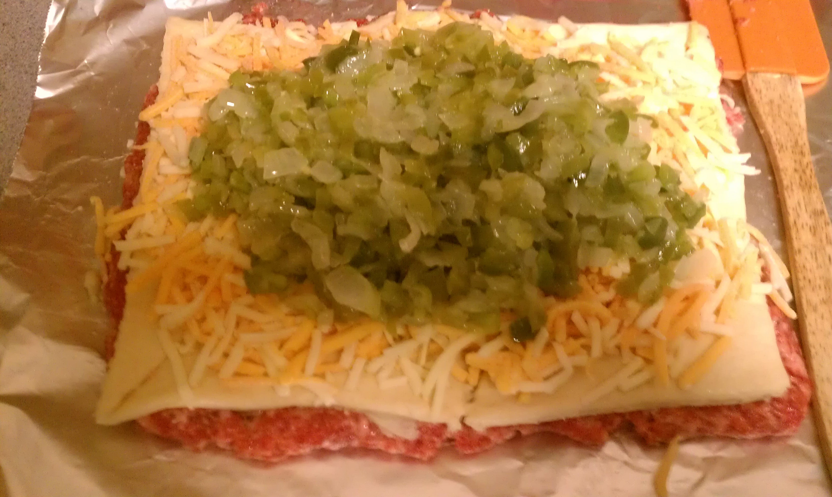 On a large piece of plastic wrap, press sausage into a square about 1 inch smaller in diameter than the bacon square. Top with a square of crescent roll dough (4 rolls), carefully pressing the sides. Top with cheese and onion/pepper mixture.
