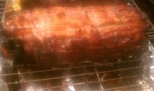 We do Bacon Explosion inspired dinner parties to celebrate the spring Equinox every year, and make different versions. If you can get your hands on it, try Stonewall Kitchen’s Vidalia Onion and Fig sauce to baste it with, every half hour, while your Explosion or Bacon Fatty bakes in the oven. It comes out caramelized and the bacon will come out like candy.