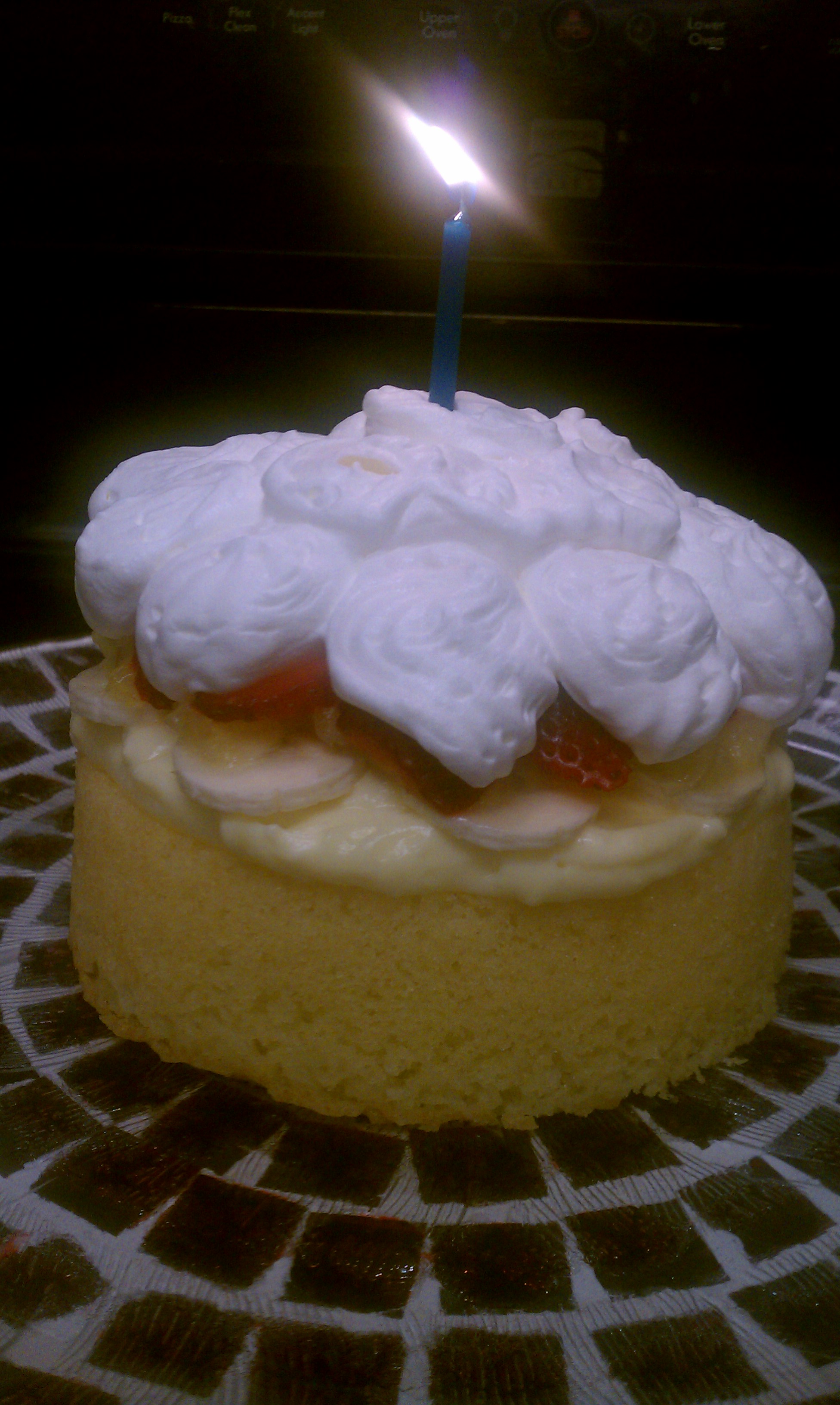 To celebrate the birth of my progeny, I’ve  made my favorite birthday cake—a fabulous combination of moist yellow cake, cream-cheesy custard, and fresh fruit…all topped with whipped cream.  And for those of you intimidated by all of the scratch baking I do, have no fear.  This is actually one of the very few things I make that starts from a box.  Go figure.