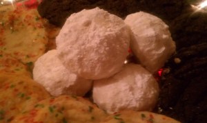 Roll walnut sized pieces of dough into balls, and place them one inch apart on a parchment lined baking sheet. Bake for 12 minutes, or until just beginning to turn golden around the bottoms. Remove and allow to cool for 3 minutes. Place 3 cups powdered sugar into a large bowl. Roll the cookies in powdered sugar and set aside. When completely cool, roll again in powdered sugar. Store in airtight container for a week.