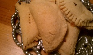 To assemble: roll dough out into 1/8” thickness……Cut into 4-6” circles using large bisquit cutters, or the rim of a large glass. Place a bit of filling on half of each circle, and fold the other half over it. Crimp edges with a fork. If filling is oozing out, use less.