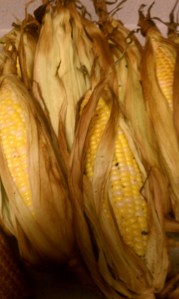 Peel the husks back from the corn, trying not to remove them. Remove the silks, and carefully replace the husks back over the corn. Tie the end with a piece of husks to secure it. Roast over low coals, not over direct flame, and with the lid closed, for half an hour. Remove to serving platter.