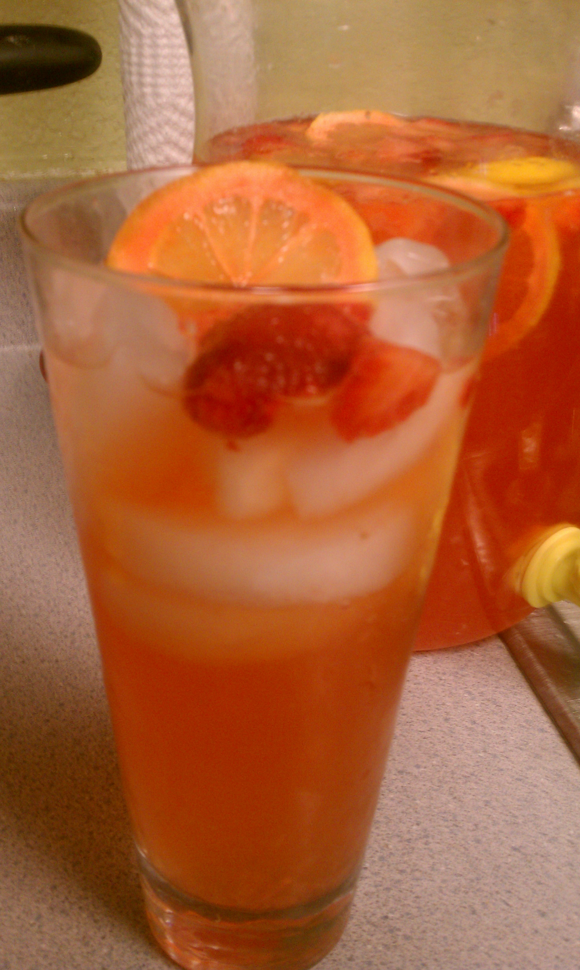 Boil water and sugar until sugar is dissoled—less than one minute. Pour into pitcher. Add lemon juice. Puree strawberries in a blender until thoroughly pureed. Add to pitcher and stir. Chill until ready to serve.