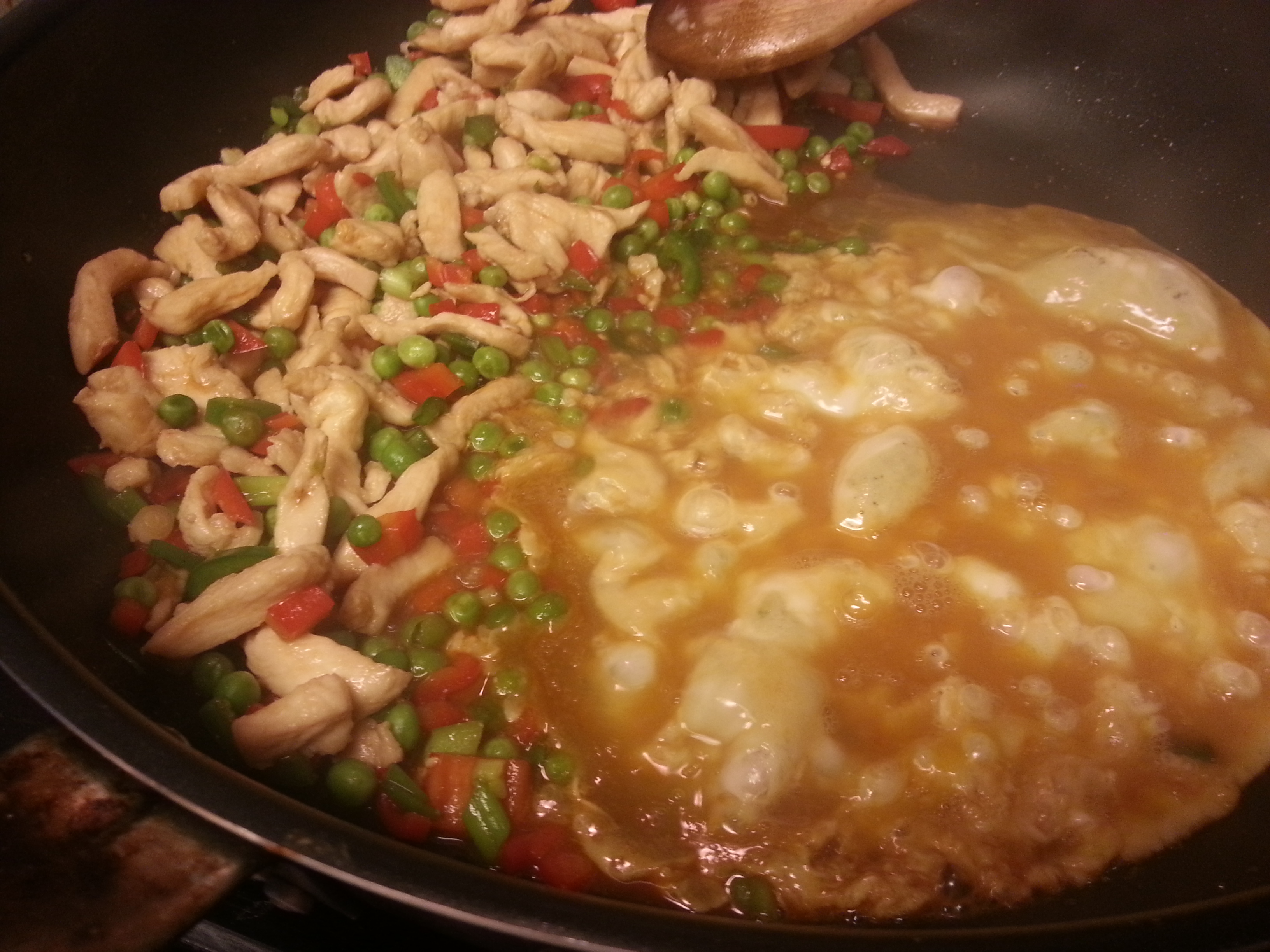 Push all of the ingredients to one side of the pan. Mix one teaspoon soy sauce into the eggs, and pour into the open space in the pan, tilting pan to keep eggs from mixing with the meat and vegetables. Cook just until the eggs are done, and break them into bite-sized pieces with your spoon or spatula.