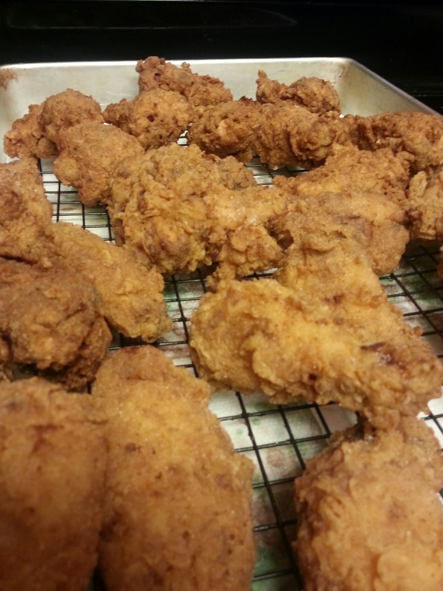 While it heats up, the chicken may start to look a little wet…This is fine—good even…. When the oil has come to temperature and you are ready to fry the chicken, give it one more toss in the flour, and shake off excess before frying for 12-15 minutes (until golden brown). Remove chicken to the CLEAN cooling rack, and try not to let the pieces touch while they drain.